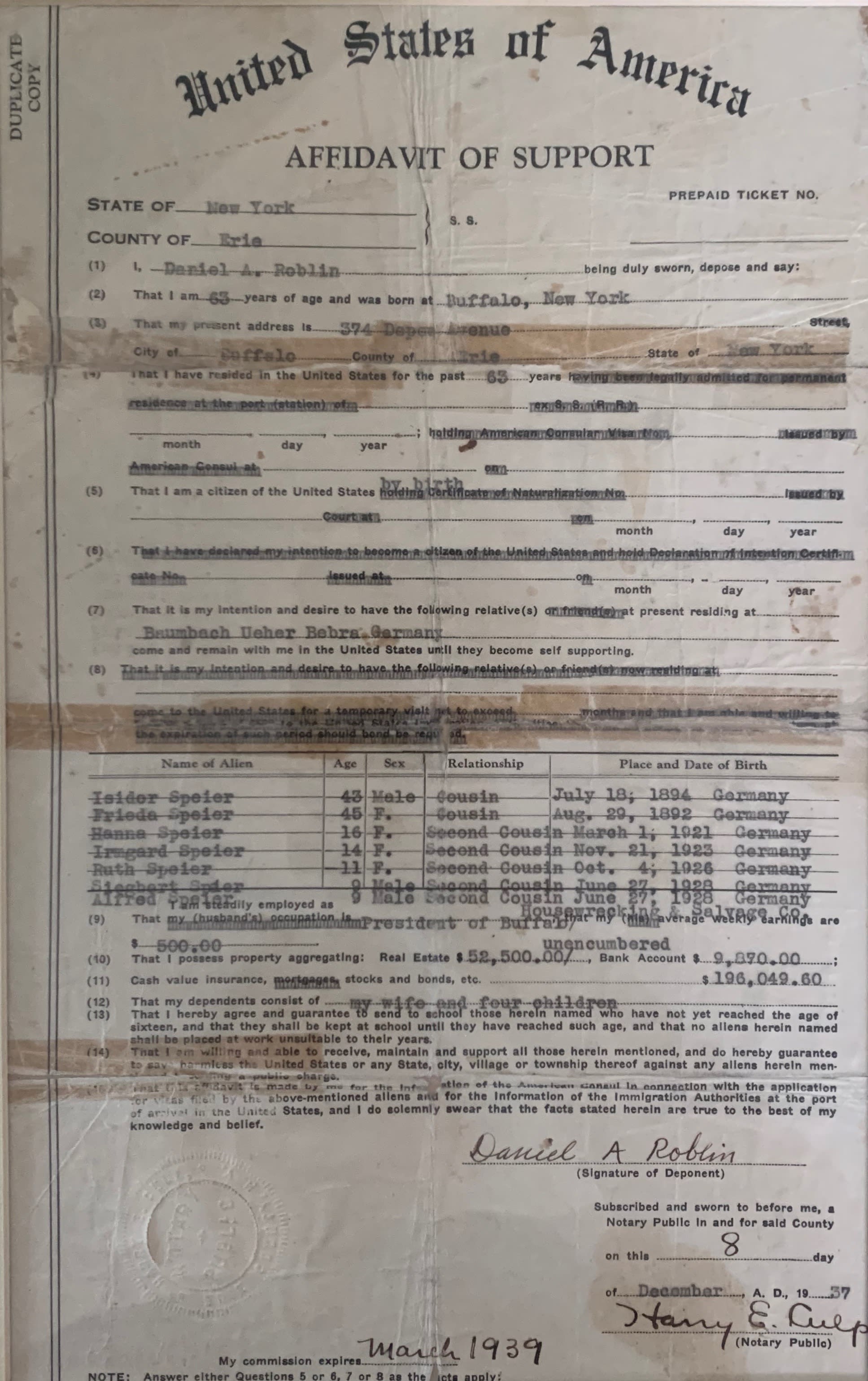 Roblin Affidavit for Speier (refugee) family, 1939. Documentary collections, Cofeld Judaic Museum